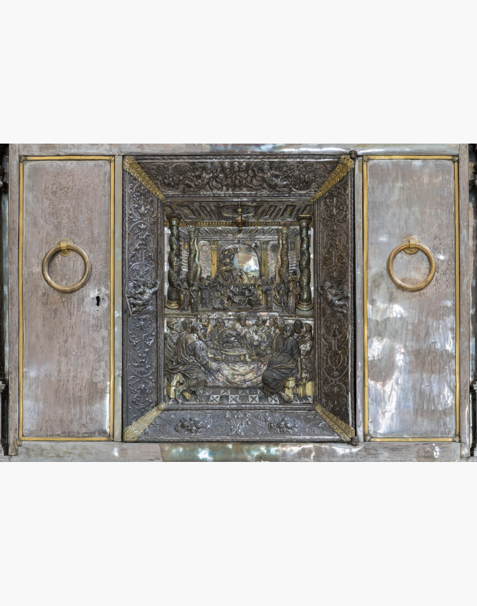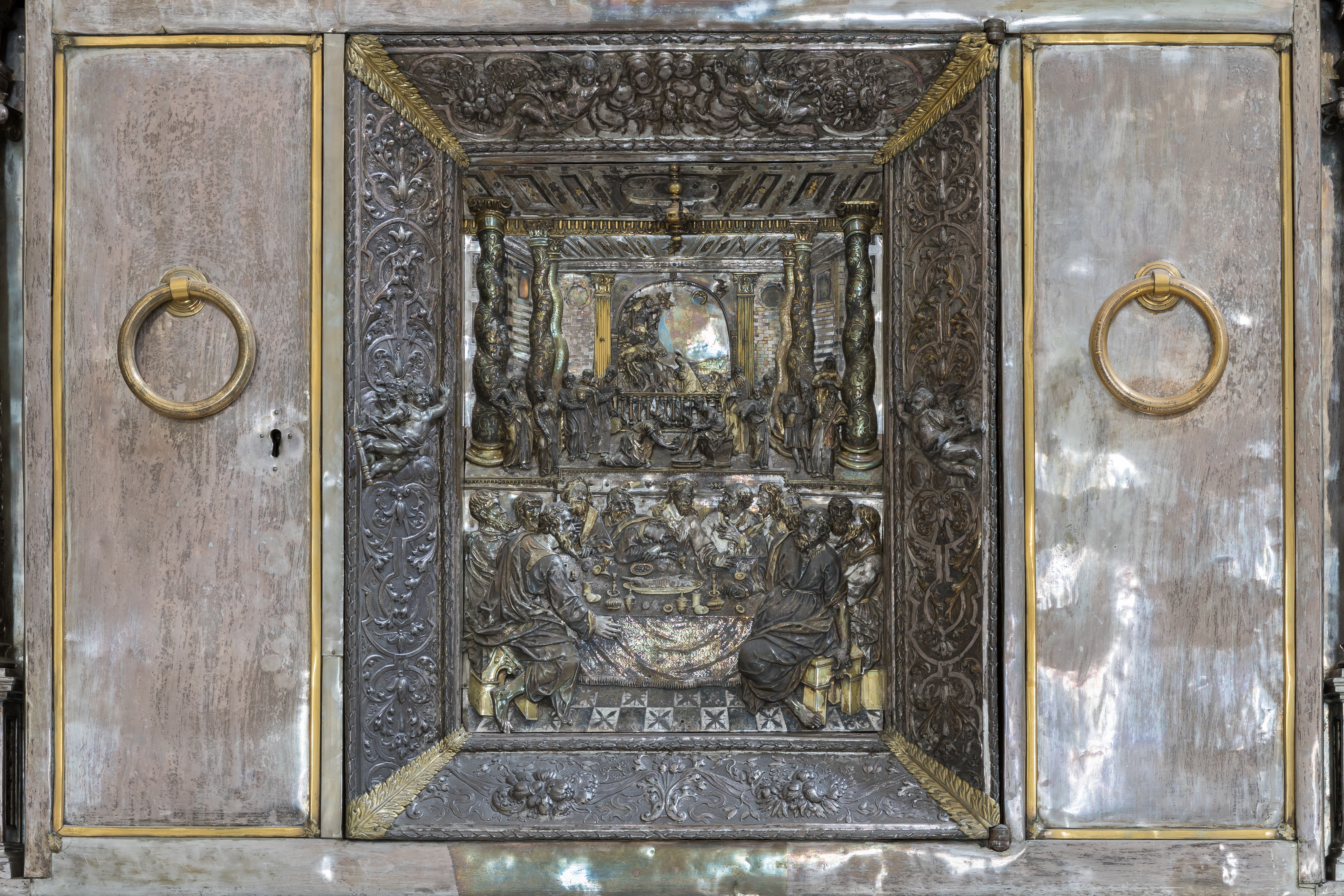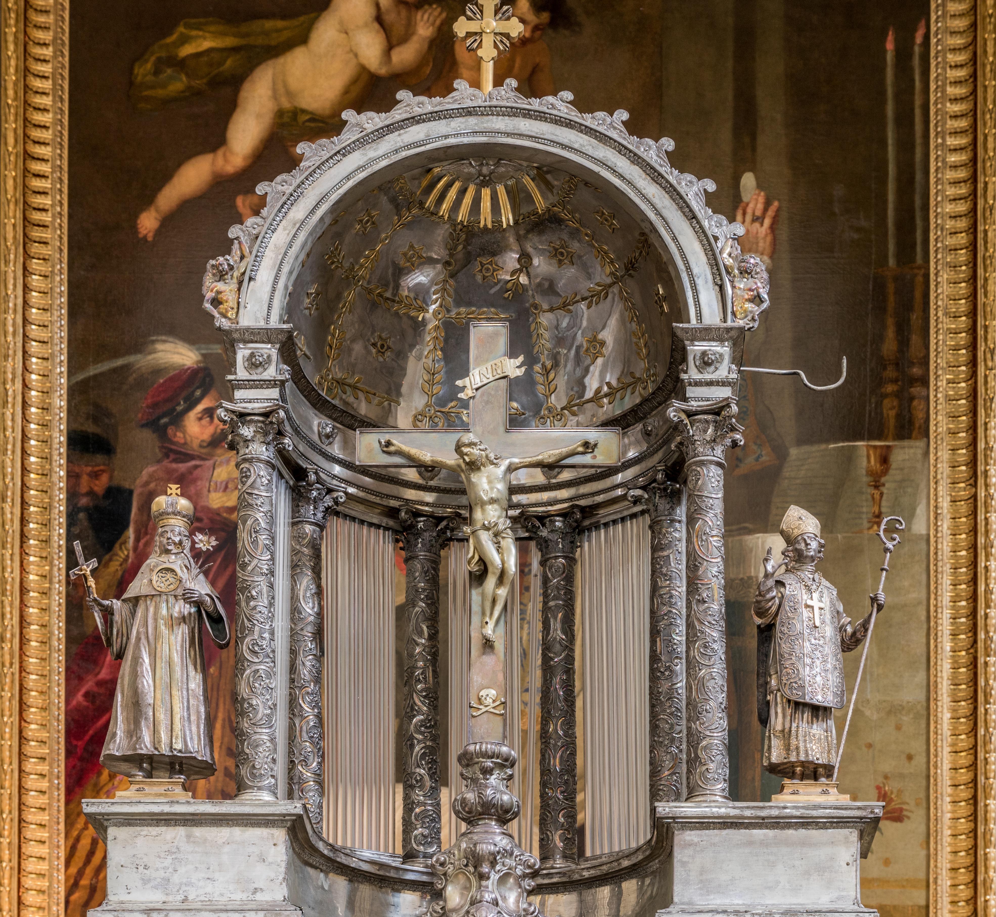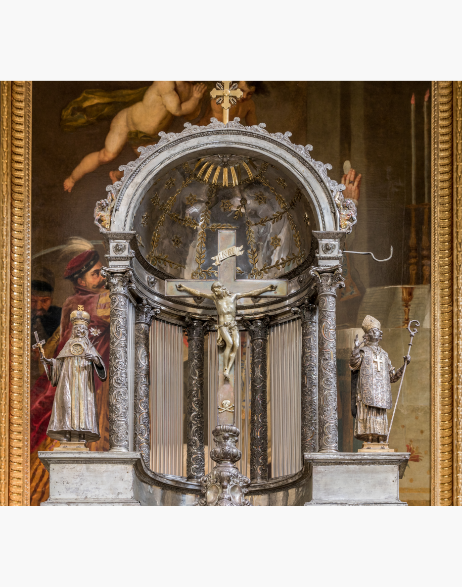 The door of the tabernacle is decorated with three reliefs (by Matthias Wallbaum) depicting The Passion: the largest is The Last Judgement, the next is Christ Washing his Disciples’ Feet, and the smallest is Christ Prays on the Mount of Olives. This masterpiece of Baroque gold was produced in 1623–1625. There is a large cross, manufactured in Józef Fraget’s workshop in Warsaw in the 19th century, on the upper tier of the tabernacle, and copies of reliquaries of St Casimir (on the left) and St Stanislaus (on the right).