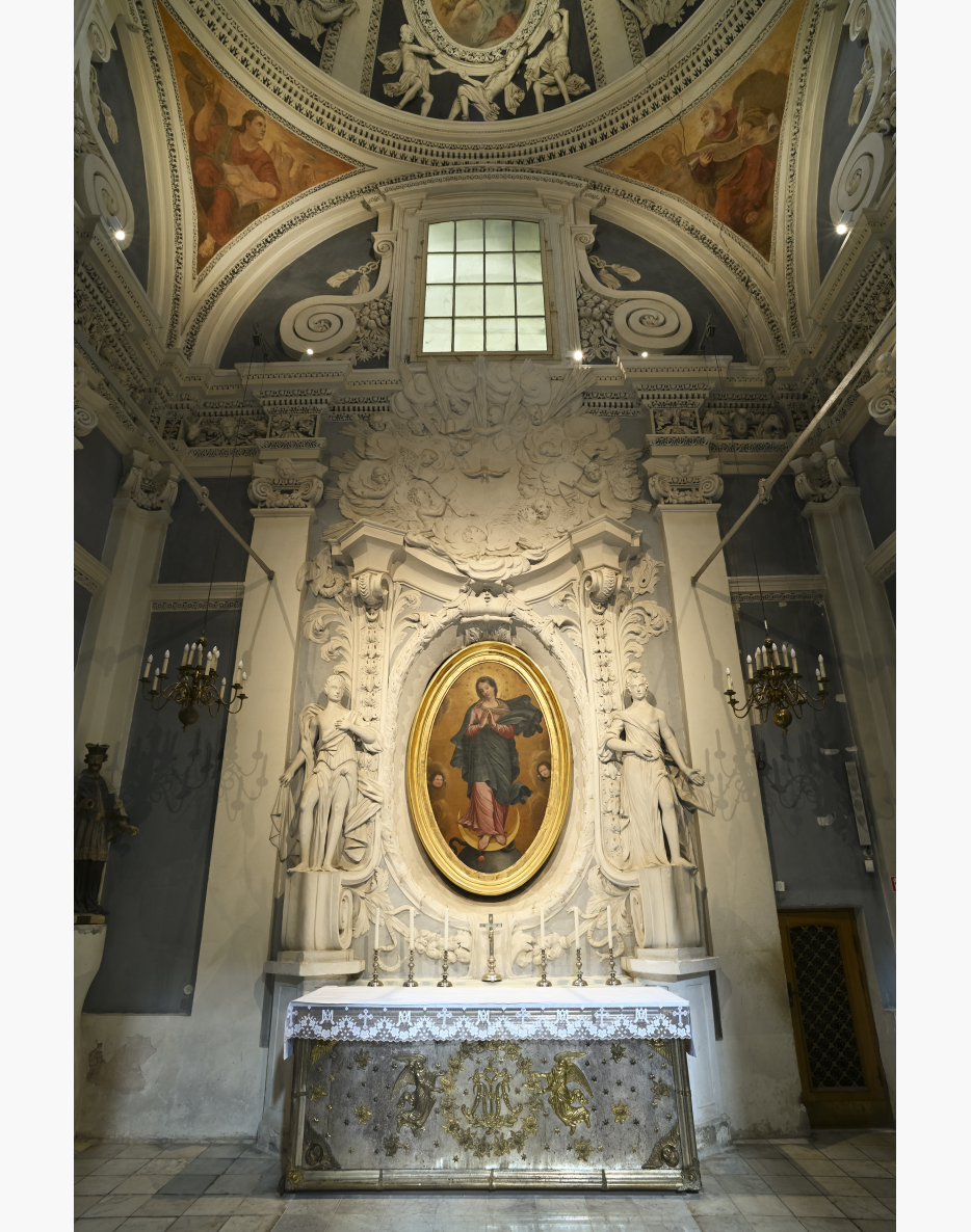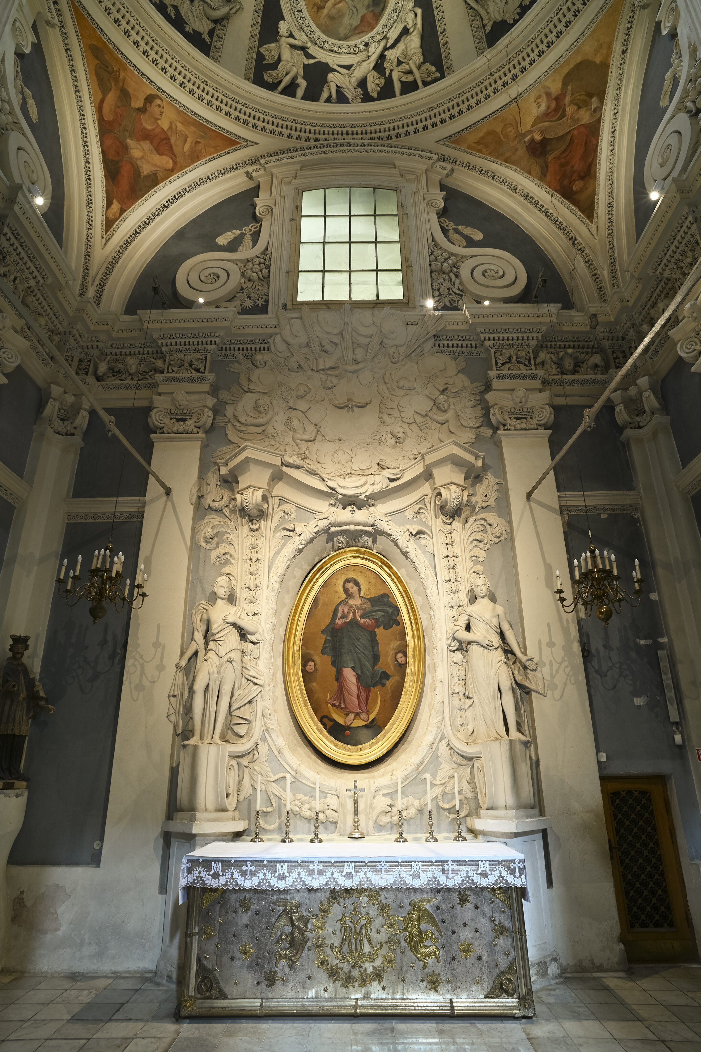 Balto stiuko altoriaus centrinėje dalyje kabo ovalios formos paveikslas „Nekaltai Pradėtoji Švč. Mergelė Marija“, nežinomo autoriaus nutapytas XVII a. Šalia paveikslo – dvi alegorinės figūros iš stiuko. Koplyčios kupolo burių freskose – keturi evangelistai. Kupolo freskose – reikšmingiausi Švč. Mergelės Marijos gyvenimo įvykiai: Apreiškimas, Apsilankymas, Dangun Ėmimas ir Dievo Motinos karūnavimas.