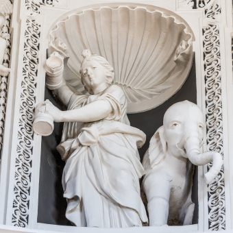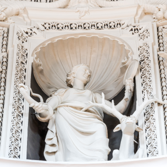 Міцність уособлює жінка в обладунках. У правій руці вона тримає дубовий жезл, що символізує силу духу. Ліва рука спирається на колону – знак стабільності. Поруч – лев, символ сили та обачності.