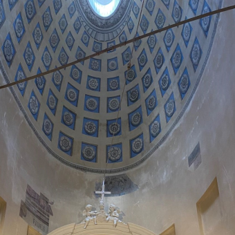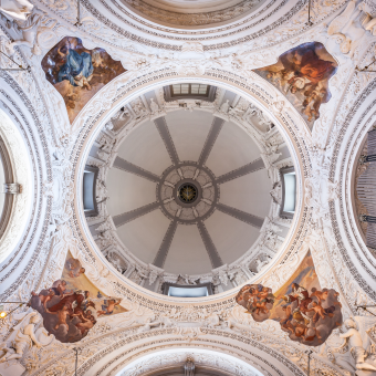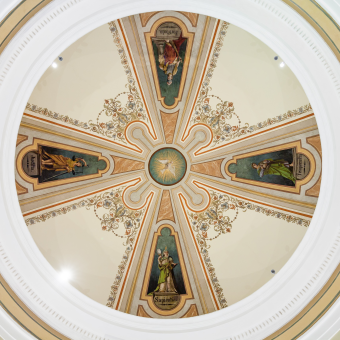 На купольних сегментах розміщені чотири композиції: над входом – “Цнотливість” і “Чеснота” (авт. Францішкус Смуглевич), над вівтарем – “Пісня святого Казимира Пресвятій Діві Марії” і “Святий Казимир ведений на небо” (авт. Мікеланджело Паллоні). У найвищій точці купола зображений голуб – символ Святого Духа.