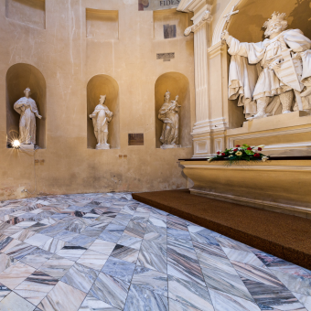 Фреска Мікеланджело Паллоні на східній стіні каплиці зображує події 16 серпня 1604 року, коли через 120 років після смерті князя було відкрито його труну. Його останки виявилися нетлінними і навіть випромінювали приємний аромат. Відкриття труни відбулося у зв'язку з канонізацією князя, яка була розпочата у 1602 році. Ця подія стала ще одним свідченням святості Казимира.
